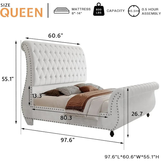 Queen Size Velvet Upholstered Platform Sleigh Bed with Scroll Headboard & Footboard